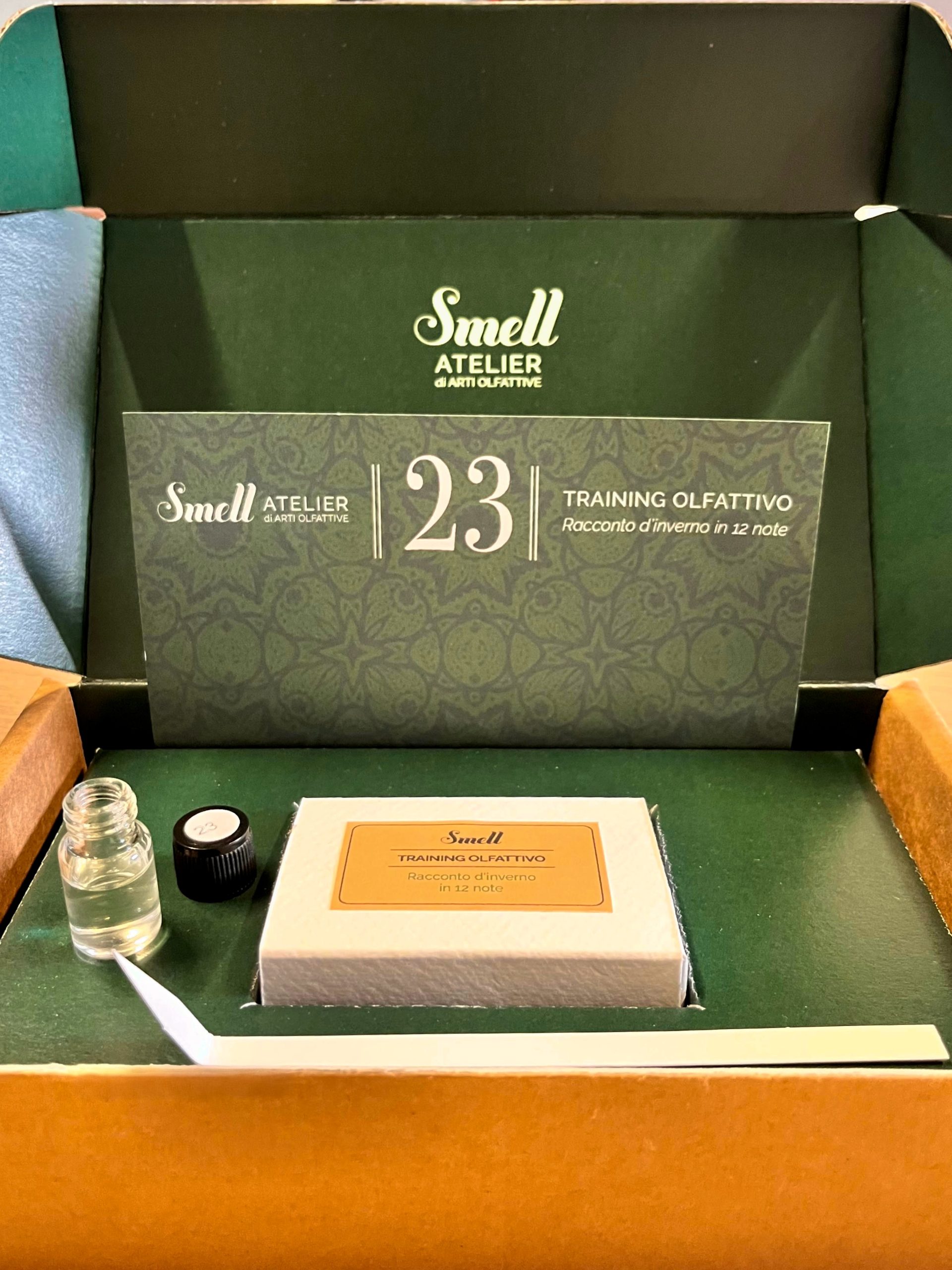 • 1 scatola (in carta pregiata) con 12 sample in vetro da 2 ml. I sample contengono sostanze sia naturali che molecolari diluite in alcol per favorire la loro migliore espressione. Scoprire l’identità dei singoli ingredienti è parte integrante del Training Olfattivo così come l’ha ideato e perfezionato nel corso degli anni Francesca Faruolo, fondatrice e direttrice di Smell Atelier.